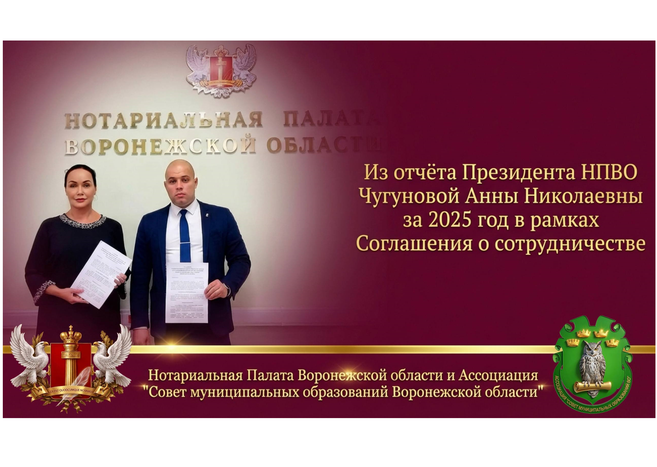 31 октября 2024 года было подписано Соглашение о сотрудничестве между Нотариальной палатой Воронежской области и Ассоциацией «Совет муниципальных образований Воронежской области». Основной целью данного документа стало совместное обеспечение прав граждан и организаций, а также улучшение качества правовой работы обеих сторон Соглашения.