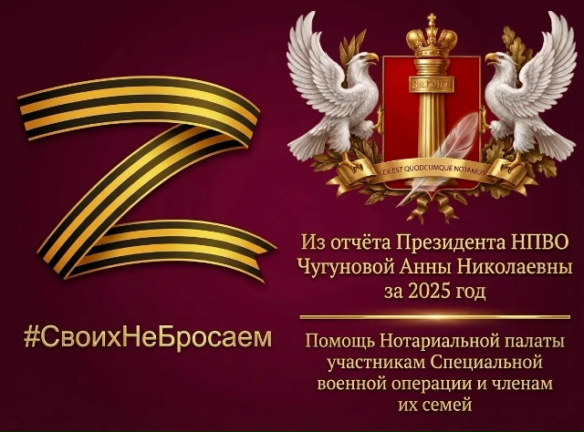 10 февраля было заключено соглашение о сотрудничестве между НПВО и АНО "Воронежский центр поддержки ветеранов специальной военной операции", а 12 февраля - соглашение о сотрудничестве между НПВО и региональным Комитетом семей воинов Отечества. На постоянной основе нотариусы НПВО проводят бесплатные правовые консультации для участников СВО и членов их семей, помогают в составлении правовых документов на базе филиала Государственного фонда поддержки участников специальной военной операции по Воронежской области «Защитники Отечества». За 2025 всего было проведено 58 мероприятий в Штабе общественной поддержки «Единой России».
